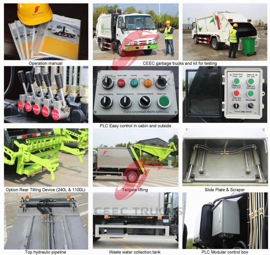Kit truk terkompresi sampah 12000Liter standar Eropa, yang menggunakan bodi pemadat bahan baja berkekuatan tinggi, model PLC kontrol impor, perangkat kontrol silinder hidrolik, kotak kontrol versi bahasa Inggris untuk pengoperasian yang mudah