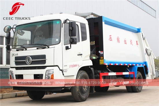 Truk kompresor sampah merek Dongfeng 14cbm, menggunakan sasis truk Mesin diesel CUMMINS 190HP, transmisi manual 6 perpindahan. Siemens teknologi kotak kontrol PLC untuk pengoperasian yang mudah, Semua lukisan dan logo berdasarkan kebutuhan klien.