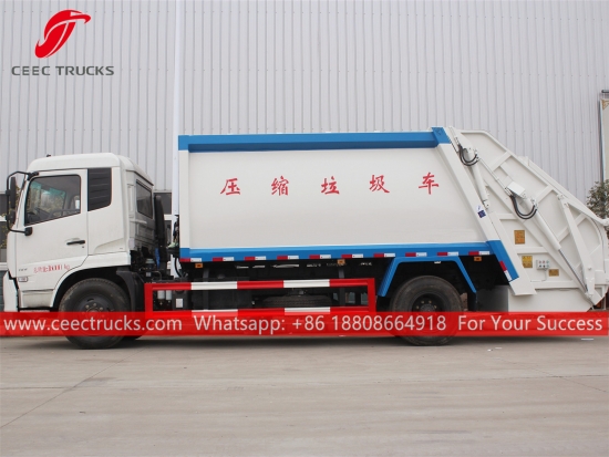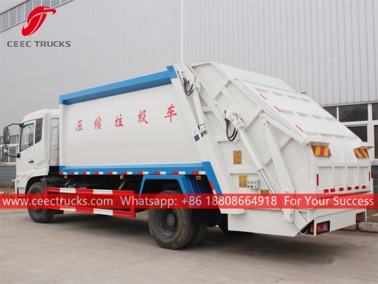 Truk kompresor sampah merek Dongfeng 14cbm, menggunakan sasis truk Mesin diesel CUMMINS 190HP, transmisi manual 6 perpindahan. Siemens teknologi kotak kontrol PLC untuk pengoperasian yang mudah, Semua lukisan dan logo berdasarkan kebutuhan klien.
