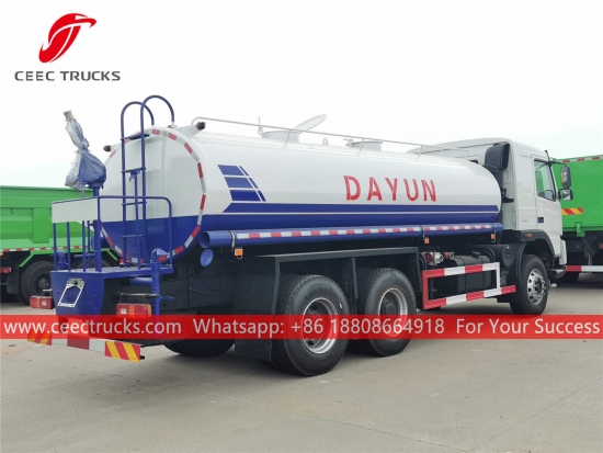 Truk tangki air DAYUN 18.000L, sasis penggerak kanan DAYUN 6x4, gearbox manual 8 shift, mesin diesel WEICHAI 270HP, pompa air merek terkenal, dengan nosel penyemprot depan, tengah dan belakang opsional. Semua lukisan dan logo bergantung pada kebutuhan.