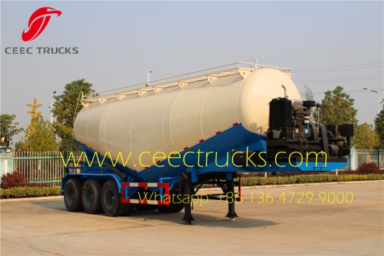 Semi trailer semen curah terbaik China yang dilengkapi dengan kompresor Udara Italia, gandar BPW Jerman, dan roda pendaratan JOST C200 membuat kinerja semitrailer ini sangat baik. kapasitas pemuatan standar untuk semitrailer bubuk bisa 20CBM hingga 70CBM.