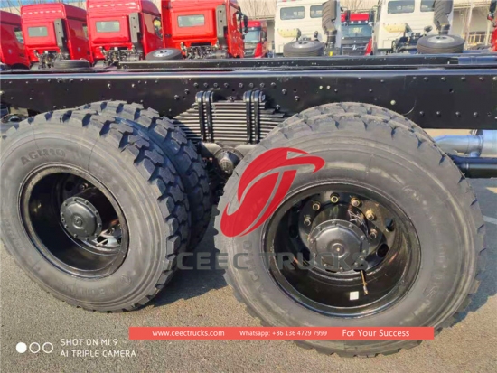 Beiben Sasis truk 2642, penggerak 6*6 dengan sistem off road, mesin diesel merek terkenal weichai 420 hp, transmisi 12JS200T yang sangat andal, jarak sumbu roda 4450+1450 mm, sistem suspensi 4 baut u yang diperkuat tugas berat, bagian depan berteknologi Mercedes benz gandar dan gandar belakang, kabin teknologi benz NG80B.