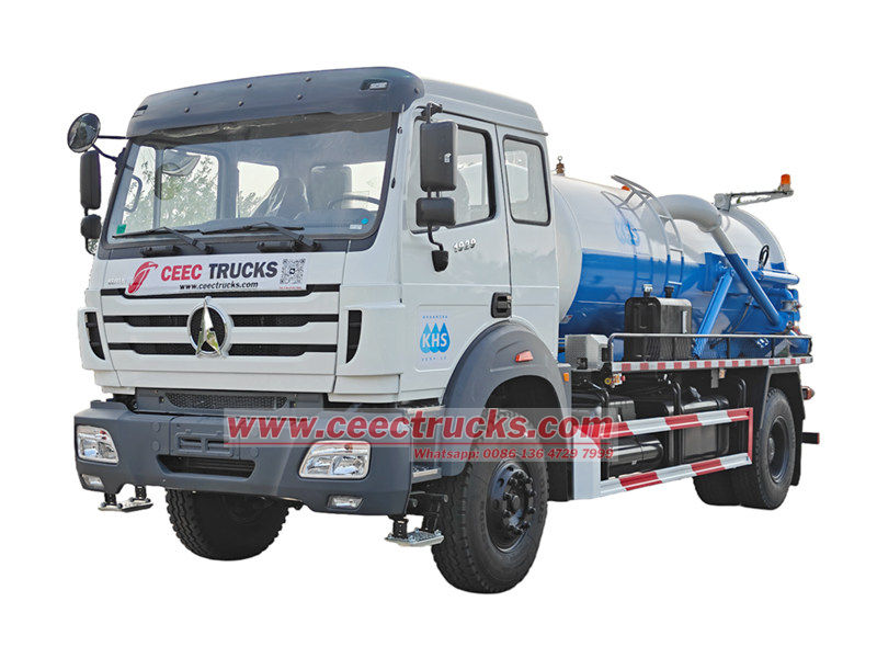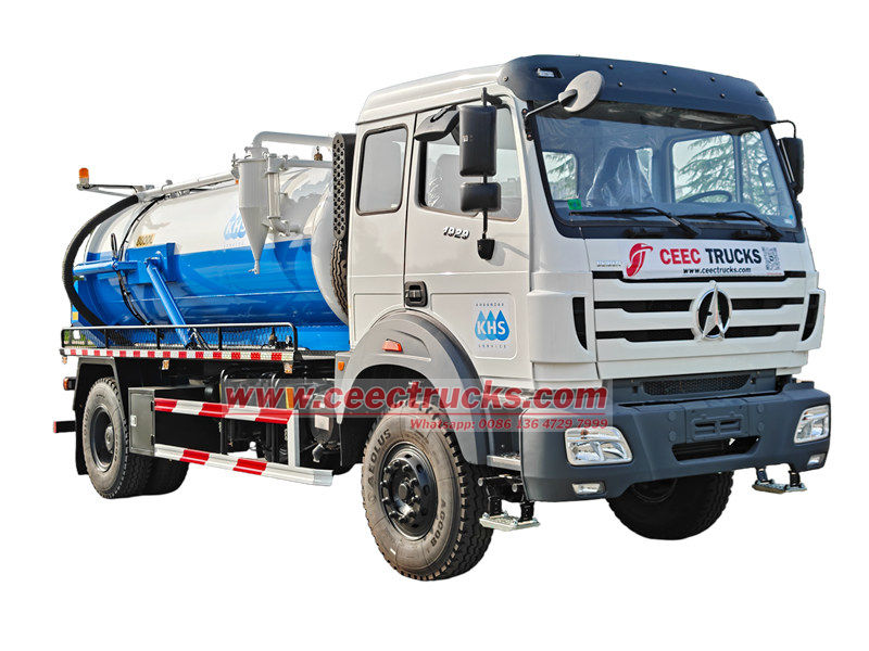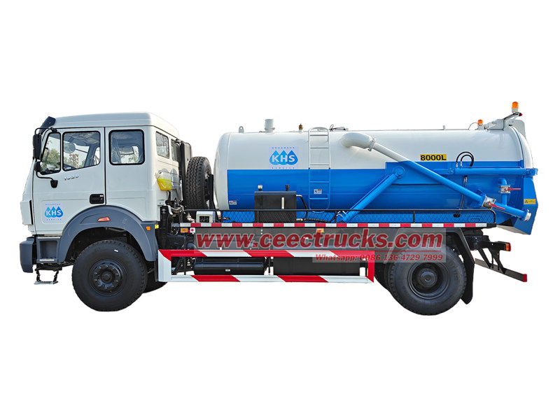Truk tangki septik Beiben 8cbm didasarkan pada sasis Beiben 1929, jarak sumbu roda 4800, emisi Euro 3 diesel 9.726L, dilengkapi dengan mesin diesel WP10.290E32 290 hp dan transmisi FAST 9JS150A, ban 12.00R20 dengan total 7 buah, yang bertenaga dan mudah dioperasikan. Kendaraan ini dilengkapi dengan tangki vakum 8cbm, yang dapat memenuhi berbagai kebutuhan pengerukan seperti saluran pembuangan perkotaan dan jaringan pipa industri.