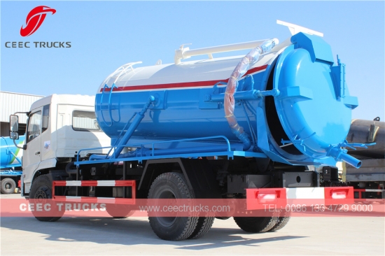 Pengosongan tangki septik Dongfeng 10000L, mesin diesel CUMMINS 170HP, gearbox manual 6-shift, tanker material baja berkekuatan tinggi dapat mencapai 10 cbm, pompa vakum WEILONG, alat pengangkat hidrolik untuk pembuangan limbah, pengecatan dan logo tergantung permintaan.