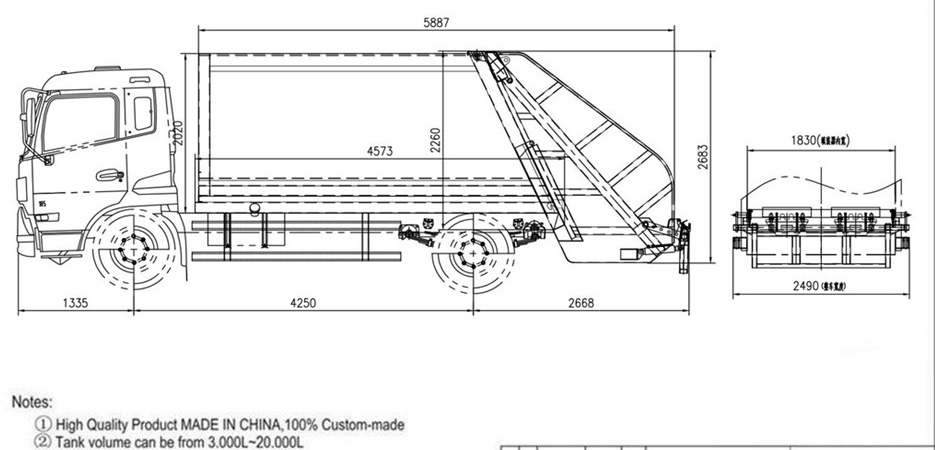 Penampilan 100% disesuaikan, desain kapasitas tempat pemadat, metode operasi dan lokasi, juga seluruh ukuran truk dapat disesuaikan .