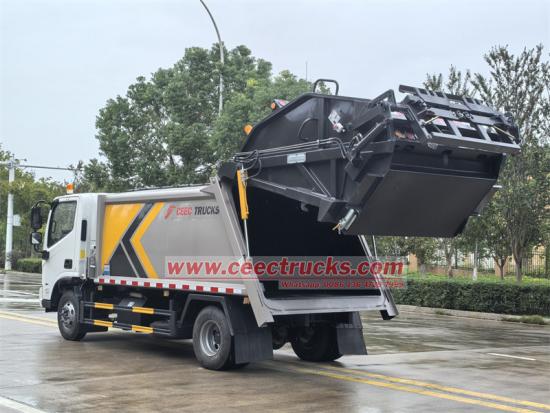 Truk pemadat sampah Foton dilengkapi dengan perangkat kemiringan belakang, model khusus dengan silinder hidrolik ganda untuk pengoperasian. Cocok untuk mengangkat wadah kontainer berstandar internasional, tersedia pilihan material plastik dan logam. Tersedia ukuran 120L, 240L, 360L, 660L, 770L, 1100L, dll.