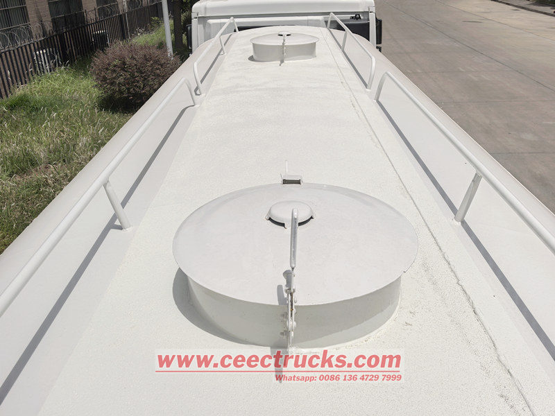 Badan bagian atas berupa tangki air baja karbon elips dengan kapasitas 20cbm, dilengkapi dengan pompa WEILONG 80QZF-60/90S, kotak penyimpanan pipa di kedua sisinya. Selain itu, kendaraan ini juga memiliki tiga mode penyemprotan opsional: nosel air depan, nosel air belakang, dan pemantauan semprotan meriam air, yang dapat memenuhi berbagai kebutuhan operasi penyiraman.