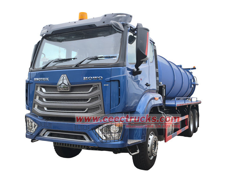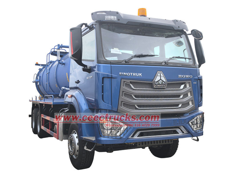 Pengosong tangki septik vakum Howo 15 cbm dimodifikasi berdasarkan sasis HOWO NX Cabin 6x4, dengan jarak sumbu roda 4325+1350mm, ban 315/80R22.5 dengan total 11 buah, dengan A/C, USB, bantuan arah. Dilengkapi dengan mesin diesel WP12.400E32 berdaya 400hp, transmisi HW19710, gigi 10 maju, gigi 2 mundur, roda kemudi ZF8118, yang kuat dan mudah dioperasikan. Kendaraan ini dilengkapi dengan tangki vakum 15cbm, yang dapat memenuhi berbagai kebutuhan pengerukan seperti saluran pembuangan perkotaan dan jaringan pipa industri.