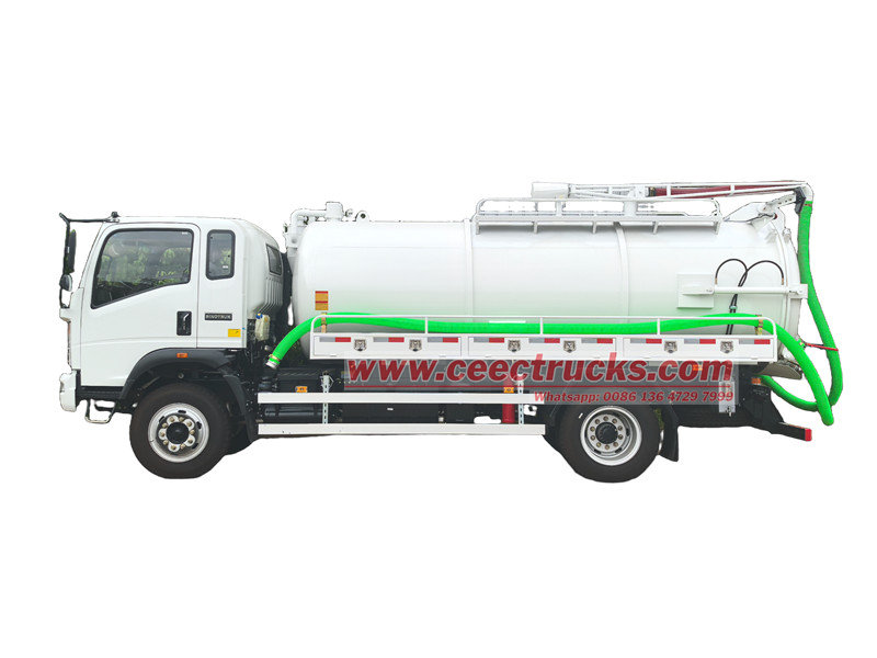 Truk septik gardan tunggal Howo 5.000 liter didasarkan pada sasis Howo 4x2 dengan jarak sumbu roda 4200, dilengkapi dengan mesin diesel YC4E160-33 160 hp dan girboks HW90510C2, 10 gigi maju, 2 gigi mundur, diesel Euro 3 dengan emisi 4.257L, ban 8.25R20 dengan total 7 buah ban, yang bertenaga dan mudah dioperasikan. Tangki terbuat dari baja karbon berkualitas tinggi dan dilengkapi pompa vakum efisiensi tinggi, yang menyediakan fungsi pemancingan otomatis, pengurasan otomatis, dan pembongkaran otomatis.