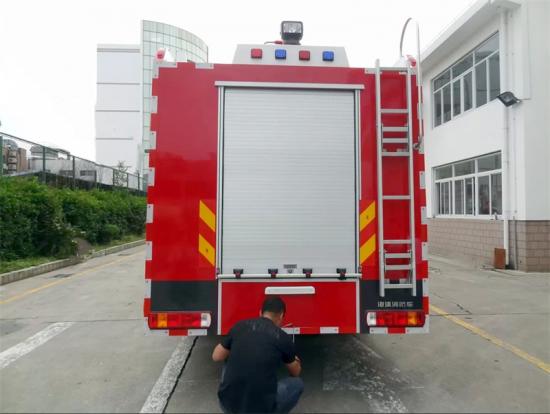 Panel operasi pompa air dalam bahasa Inggris, spatbor harus berwarna hitam, dengan lampu alarm, tangga yang dapat dilepas, kotak peralatan belakang bodi di bawah arah kemiringan ke atas sekitar 45 derajat, semua antarmuka kendaraan dan aksesori adalah Inggris, dengan gulungan selang bertekanan tinggi hitam sepanjang 30m |