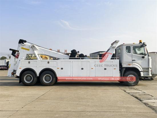 Berat ini duty wrecker, built by CEEC Trucks Group, utilizes the Howo NX cabin 6 x 4 drive chassis and is equipped with a powerful Howo WP10.340E22 diesel engine (3 4 0 HP /1250N . m of torque) and an HW1 9710 10 -speed transmission. Combined with an HF9-ton front axle and HC16-ton rear axle, it ensures exceptional power, load-bearing capacity, and reliability. It incorporates two 1 2 ton s hydraulic winches, resulting in an impressive rated towing capacity of 30 tons, making it ideal for handling accidents involving large trucks, buses, and construction machinery.