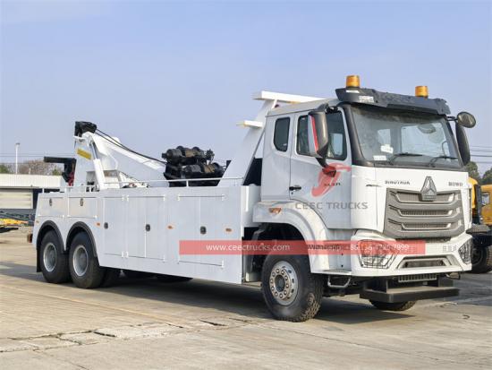 With two 10tons hydraulic winchesIni heavy duty wrecker , built by CEEC Trucks Group, utilizes the Howo NX cabin 6 x 4 drive chassis is equipped with a powerful WP10.340E22 diesel engine,3 4 0 HP /1250N . m of torque,HW1 9710 10 -speed transmission. Combined with an 9 ton front axle and 16 ton rear axle, it ensures exceptional power, load-bearing capacity, and reliability. It incorporates two 1 2 ton s hydraulic winches, resulting in an impressive rated towing capacity of 18 tons, making it ideal for handling accidents involving large trucks, buses, and construction machinery.