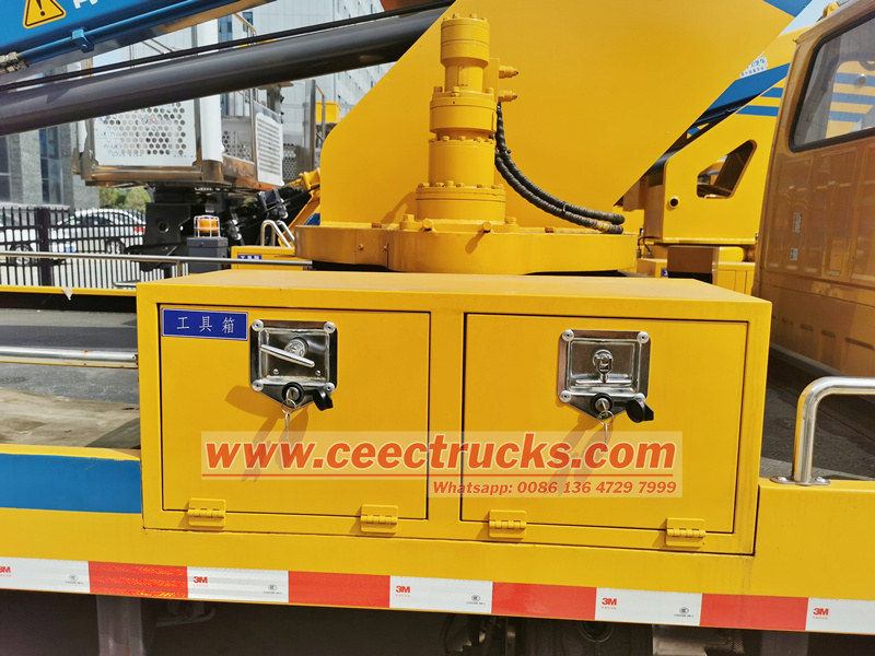 6 Fitur dan Detail Lanjutan: Inverter dan sakelar daya truk, pegangan cadik yang dimanusiakan, Sumber Daya Darurat Soket daya 220V, lengan teleskopik multi-tahap di luar gulungan pipa untuk pemeliharaan yang mudah, 5 bagian lengan dan 4 bagian lengan teleskopik yang disinkronkan, bahan baja super 960, kaki kotak persegi stabil dan dapat diandalkan