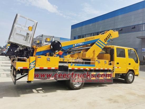 Truk CEEC Platform Aerial Hidraulik Truk yang Dipasang Berdasarkan Jenis IIZU Ganda Isuzu Chassis Truk 4x2, Dipasang dengan 4 pintu dan 2 baris benar -benar 2+4 kursi, lengan teleskopik dapat mencapai ketinggian 24 meter operasi udara, banyak digunakan dalam pemeliharaan jalanan, lansekap pekerjaan, video televisi, rekayasa komunikasi, dekorasi bandara, dekorasi, aerial iklan dan lansekap lainnya