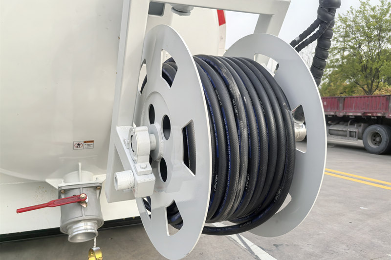 Bodi tangki kendaraan ini terbuat dari baja karbon Q355 berkualitas tinggi. Silinder dan kepala silinder dilas dengan pelat baja karbon setebal 6 mm dengan las lurus.Strukturnya kokoh. Badan tangki terbuat dari bahan anti-korosi dan dilengkapi dengan alarm level cairan dan perangkat pembuangan cepat.