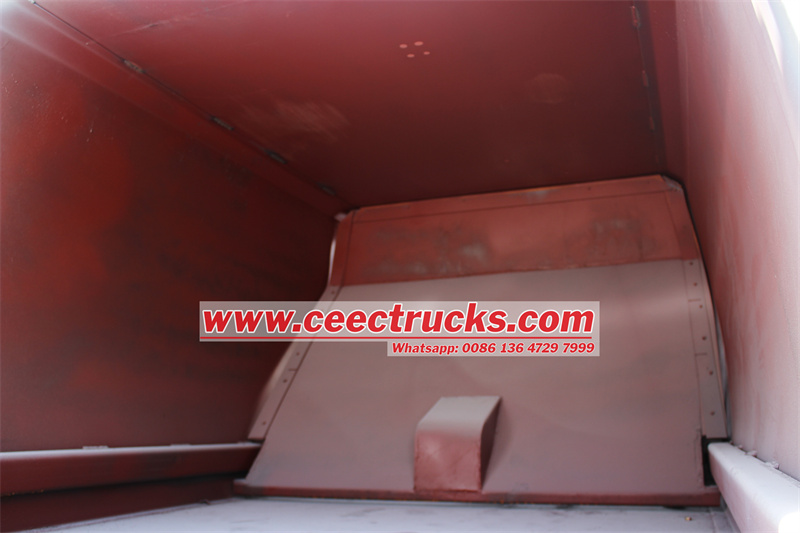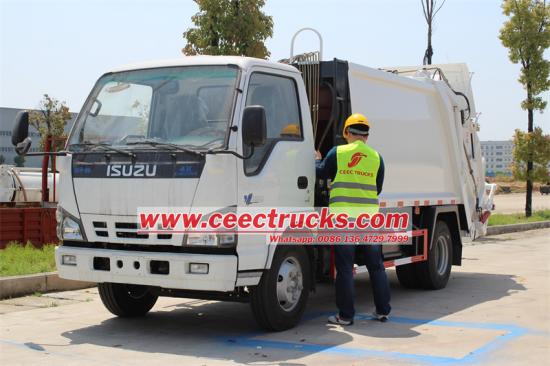 Rear tilting device for 240L and 1100L binsIsuzu 6 Wheeler Municipal Municipal Rear Loader Truk Sampah juga bisa dipanggil Isuzu NKR 6CBM Tolak Truk Sampah, yang adalah seorang profesional yang kuat Kendaraan Pembuangan Sampah. The Isuzu 6cbm rear loader compactor truck produced by CEEC TRUCKS is equipped with Isuzu 4x2 ELF 600P chassis,Isuzu 120HP 4KH1 diesel engine, Euro 6 2999ml displacement, 3360mm wheelbase, 2+1 seats with AC inside cabin, air brake system with ABS, Inline 4-cylinder 4-stroke diesel engine, direction assistance Truk ini memiliki 3 mode operasi, termasuk kontrol listrik can-bus di kabin, joystick hidrolik, kotak kontrol listrik CAN-Bus di bak truk