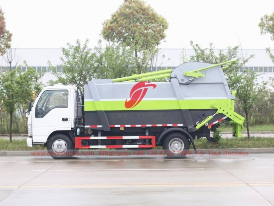 Truk kompresor sampah anti bocor ISUZU 7cbm, sasis truk menggunakan mesin diesel ISUZU 98HP, gigi transmisi MSB 5 shift. Badan pemadat mengadopsi struktur berbentuk perahu dan sistem kontrol CAN untuk pengoperasian yang mudah. Semua lukisan dan logo berdasarkan kebutuhan klien.