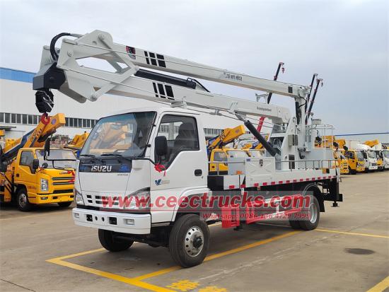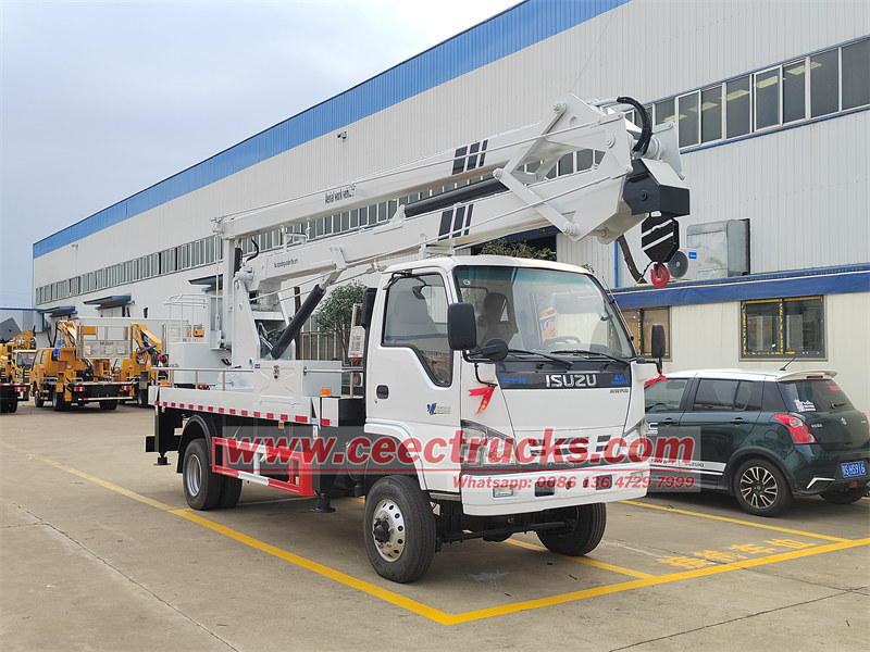 Isuzu Manlift Truck Alsocalled AerialPlatformruck ArticulatedBoomlift, TruckMountedaialPlatform, AerialWorkPlatform, Hydraulicbeam Lifter, Bucket Truck, Bucket Boom Truck, Truck Mounted Crane, Truck Mounted Aerial Lift, Telescopic Truck Platform, Platform Kerja Aerial Working Truck yang memiliki tinggi kerja udara 14m, 16m, 18m, 20m, 22m, 24m, 26m, 28m, 30m, 32m Dan sistem rotasi akan memungkinkan rotasi 360 derajat kontinu, dengan sistem keamanan untuk mencegah penurunan mendadak jika terjadi kegagalan.