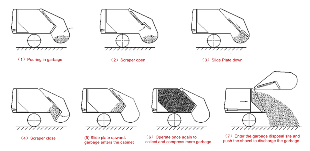 Proses kerja truk sampah kompresi ditunjukkan pada gambar