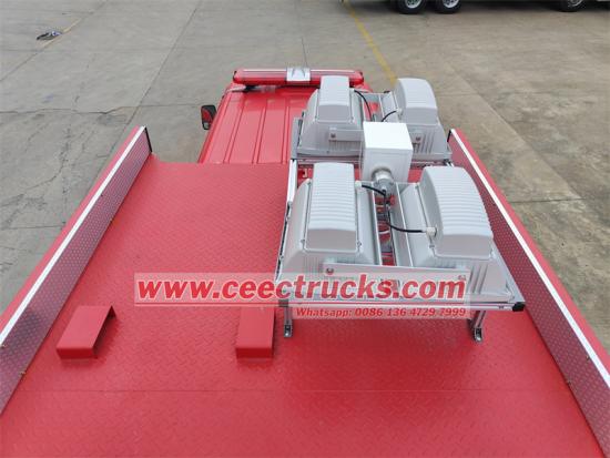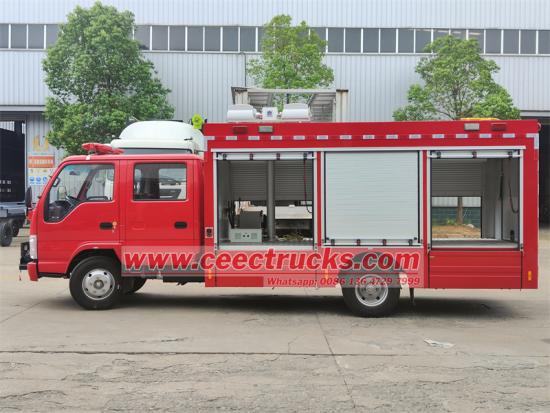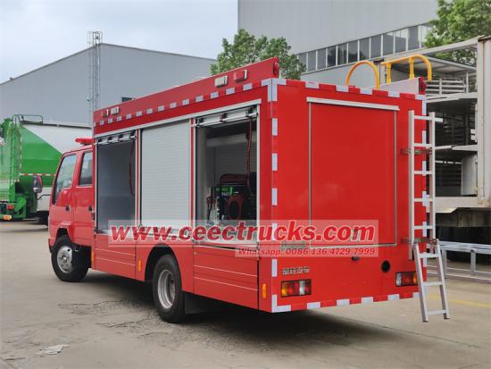 Truk pemadam kebakaran multifungsi tipe mini ISUZU, ruang kemudi dua baris dengan 2+4 kursi, termasuk 4 kursi SCBA, dilengkapi dengan mesin diesel 4KH1CN6LB dengan 88KW dan 120HP, transmisi manual MSB 5 shift dengan 5 maju dan 1 mundur. Bagian belakang ruang kru dimodifikasi untuk pemadaman kebakaran, lebih banyak anggota kru, tenaga kuat, kinerja mekanis bagus, struktur dan tata letak masuk akal, juga dipasang dengan perangkat penerangan pengangkat teleskopik, pengoperasian dan perawatan mudah, sesuai dengan persyaratan kebakaran pertempuran sebenarnya.