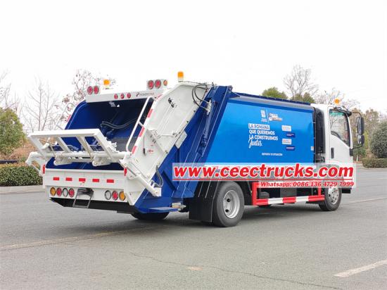 Isuzu 700p 10cbm compactor pemuat belakang CEEC digunakan untuk pengumpulan dan pembuangan sampah Dengan wheelbase 4175mm, mesin 4HK1 190HP, emisi diesel Euro 6 5193ml, gearbox Isuzu Mld 6-shift, dengan A/C, USB, bantuan arah, 3 kursi Tubuh bagian atas adalah tempat sampah 10cbm, belakang adalah mekanisme flip ember, ada 4 metode untuk mengoperasikan pemuatan dan pembongkaran truk.