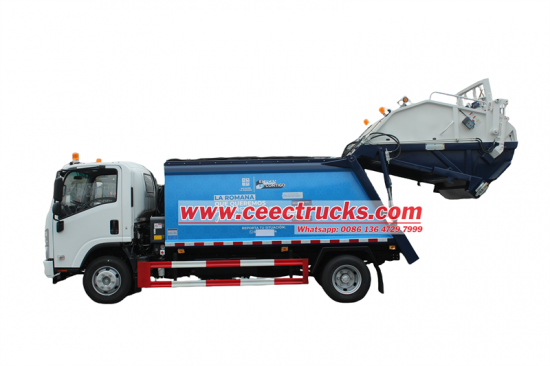 Isuzu 700p 10cbm compactor pemuat belakang CEEC digunakan untuk pengumpulan dan pembuangan sampah Dengan wheelbase 4175mm, mesin 4HK1 190HP, emisi diesel Euro 6 5193ml, gearbox Isuzu Mld 6-shift, dengan A/C, USB, bantuan arah, 3 kursi Tubuh bagian atas adalah tempat sampah 10cbm, belakang adalah mekanisme flip ember, ada 4 metode untuk mengoperasikan pemuatan dan pembongkaran truk.