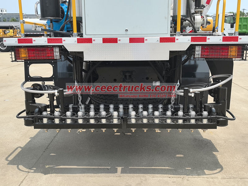 Bagian belakang truk tangki distributor aspal Shacman X3000 dilengkapi dengan batang semprot yang dapat ditarik dan lebarnya dapat disesuaikan, serta dilengkapi beberapa set nosel pengontrol aliran presisi tinggi. Alat ini dapat menyesuaikan volume dan cakupan penyemprotan secara akurat sesuai kebutuhan konstruksi (seperti lapisan permeabel, lapisan perekat, dan lapisan penyegel), dan mencapai rentang penyemprotan variabel yang luas, yaitu 0,2-3L/㎡.