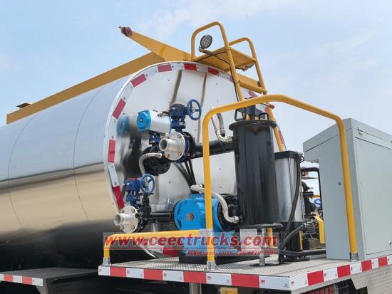 Bodinya dilengkapi tangki insulasi berkapasitas besar, yang menggunakan material insulasi berefisiensi tinggi dan sistem kontrol suhu cerdas. Tangki ini dapat menyimpan aspal panas atau aspal modifikasi dengan berbagai mutu untuk waktu yang lama, memastikan suhu material yang stabil dan fluiditas yang baik.